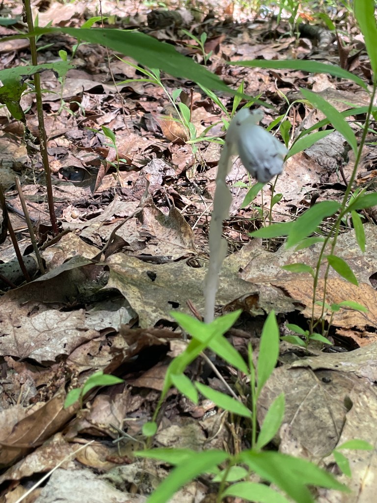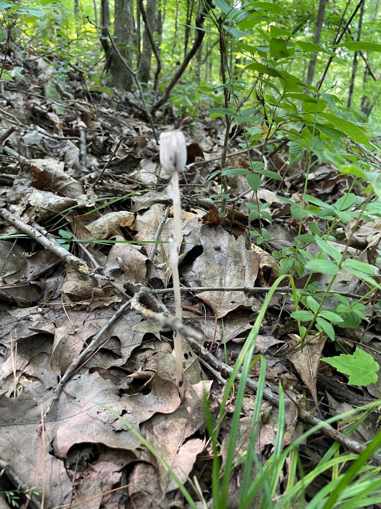 The areas that I have found Monotropa uniflora have all been on ridge or gully slopes. I believe this is due to its unique symbiotic relationship with mycorrhizal fungi, “usually a russula or lactarius mushroom” and surrounding trees.(5) This allows it to have no need for chlorophyll to survive and thrive which is why they have so little color they basically look like a milky clear translucent whitish color. I would say sometimes they look almost clear. When they die and are dried they turn a dark purplish black.)
